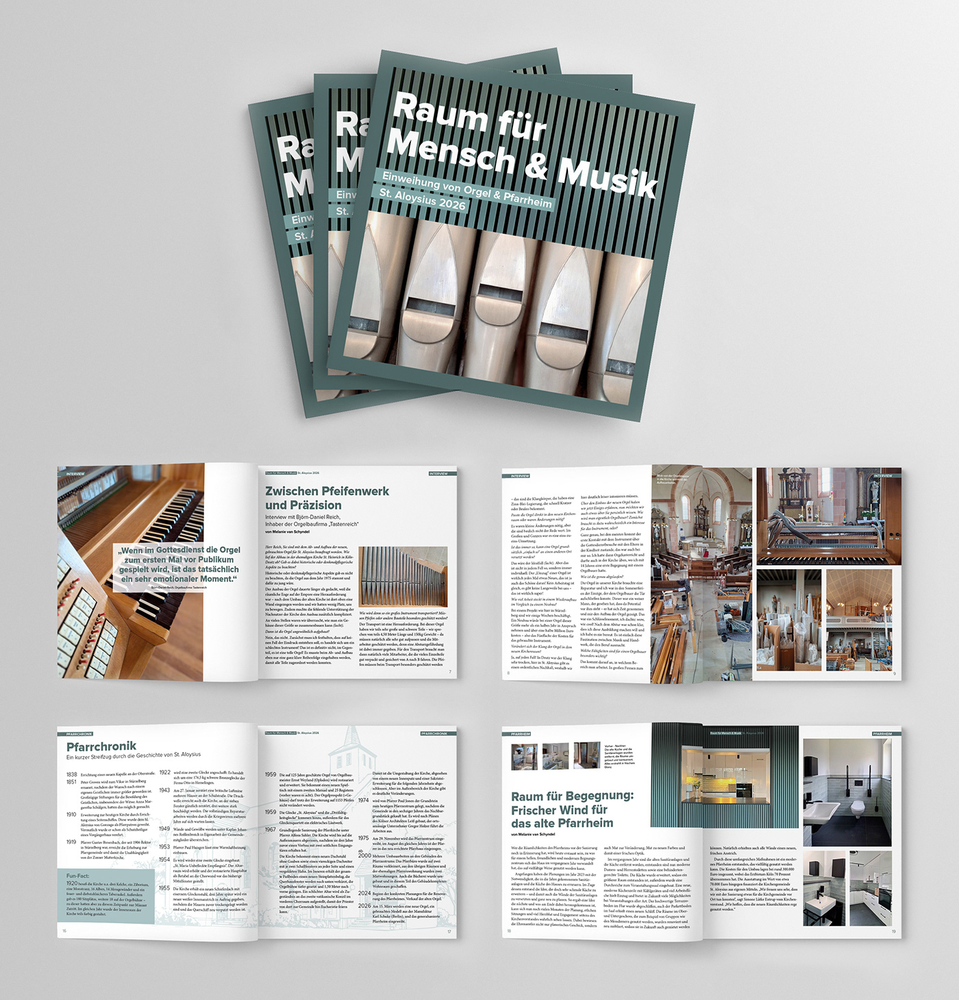 Für die Festschrift zur Einweihung der neuen Orgel und des renovierten Pfarrheims in St. Aloysius habe ich das gestalterische Konzept des Heftes entwickelt. Mir war wichtig, beide Anlässe nicht getrennt zu betrachten, sondern visuell miteinander zu verbinden. So entstand der Titel „Raum für Mensch und Musik“, der die Verbindung von Gemeinschaft und Klang aufgreift und sich durch die gesamte Gestaltung des 16-Seitigen Magazins zieht.