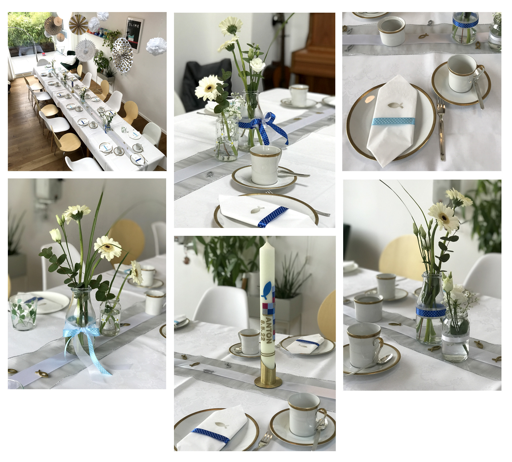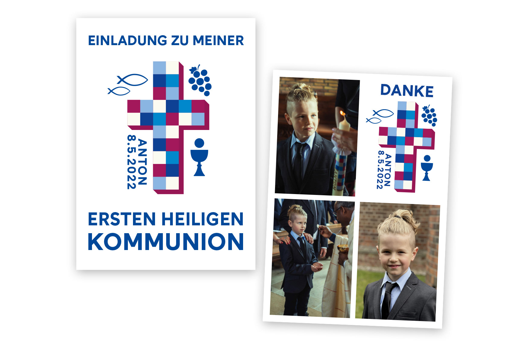 Allround-Paket zur Ersten Heiligen Kommunion. Die Kerze wurde mit und nach den Wünschen des Kommunionkinds gebastelt, Einladung und Danksagung passend dazu gestaltet.