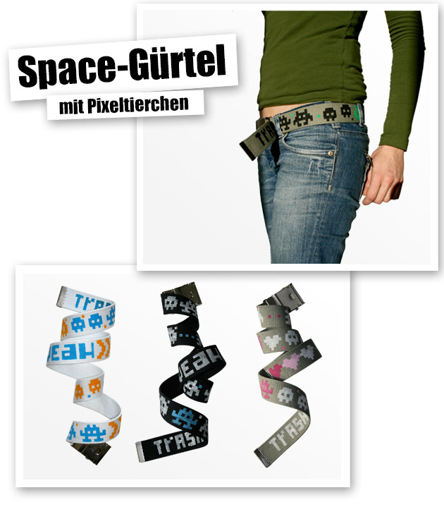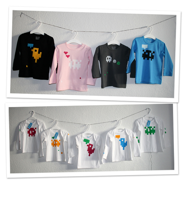 Liebevoll handbedruckte Gürtel und Baby-Klamotten in Anlehnung an Computerspiele unserer Jugend.